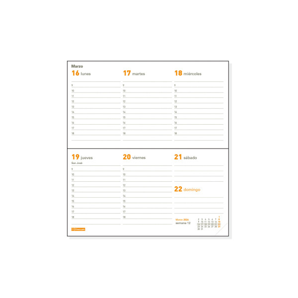 Agenda encuadernada de bolsillo muy ligera y práctica. Con cubierta de plástico transparente muy resistente al uso. Con esquinas microperforadas para localizar rápidamente el día/semana en curso. La agenda incluye información de interés en la anualidad y otros contenidos extra.