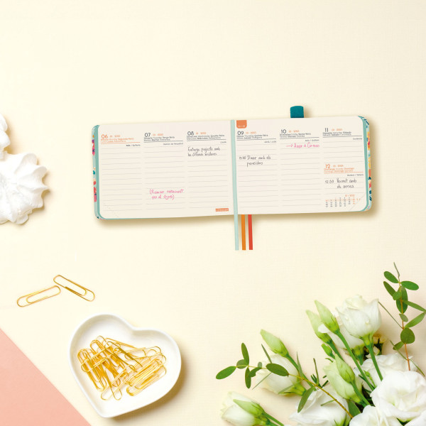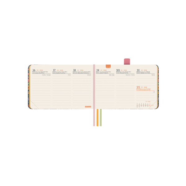 Agenda de tapa dura con diseños en tendencia y a la moda. Apertura perfecta para poder escribir cómodamente. Con tres cintas punto de colores y bolsillo interior con fuelle de papel-tejido muy resistente al uso. Con goma elástica y anilla portabolígrafo para llevar siempre contigo un elemento de escritura. Esquinas microperforadas para localizar rápidamente el día/semana en curso. Para facilitar la localización de cada mes, la anualidad incorpora un indicador en el lateral derecho de las páginas. La anualidad contiene información de interés y otros contenidos extra.