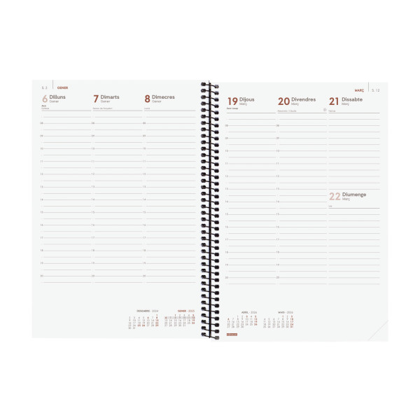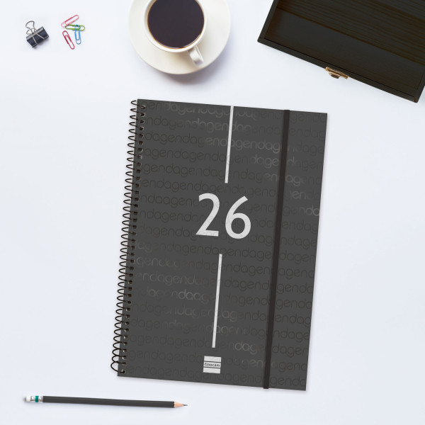 Agenda de espiral de estilo moderno. Con tapas ligeras de polipropileno y goma elástica. Ideal para uso personal y/o profesional. Esquinas microperforadas para localizar rápidamente el día/semana en curso. Agenda con información de interés en la anualidad y otros contenidos extra.