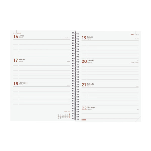 Agenda de espiral de estilo moderno y universal con tapas ligeras de polipropileno. Con goma elástica. Con esquinas microperforadas para localizar rápidamente el día/semana en curso. Agenda con información de interés en la anualidad y otros contenidos extra.