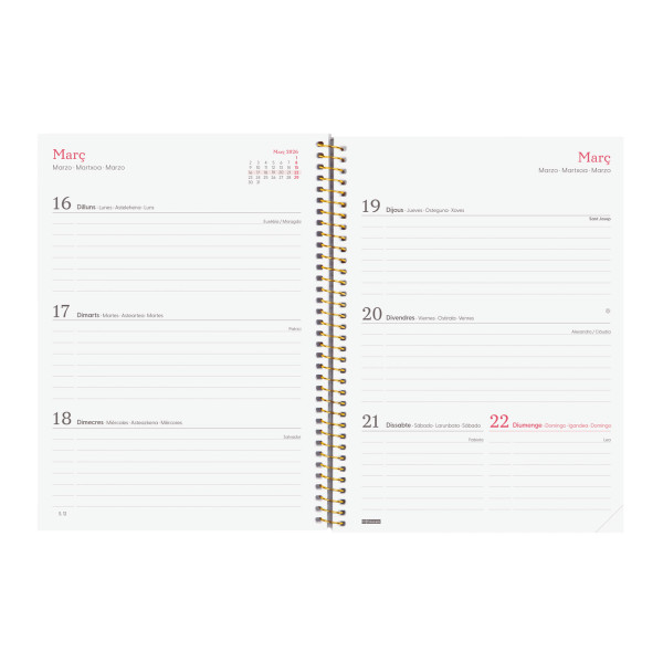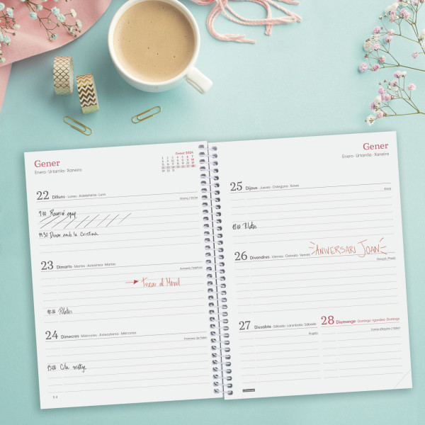 Agenda de espiral con tapas ligeras de polipropileno. Diseño en tendencia y a la moda. Ideal para uso personal y/o profesional. Con goma elástica. Con esquinas microperforadas para localizar rápidamente el día/semana en curso. El diseño interior es limpio y fácil, con espacio suficiente para organizar tus proyectos, tareas y compromisos. Agenda con información de interés en la anualidad y otros contenidos extra orientados a la organización personal.