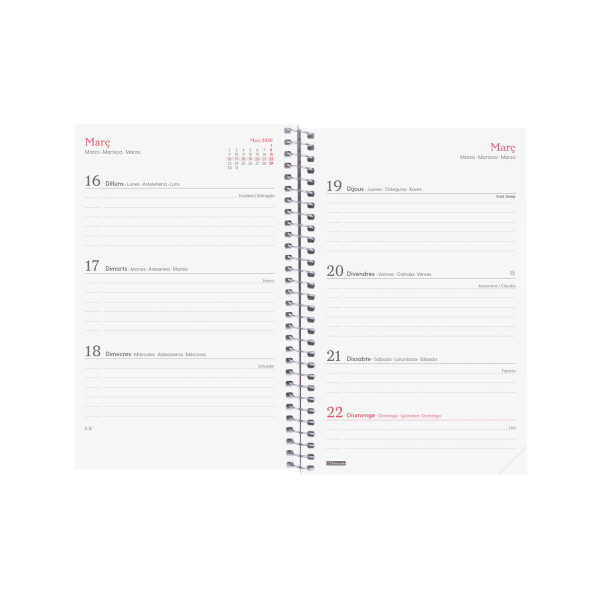 Agenda de espiral con tapas ligeras de polipropileno. Diseño en tendencia y a la moda. Ideal para uso personal y/o profesional. Con goma elástica. Con esquinas microperforadas para localizar rápidamente el día/semana en curso. El diseño interior es limpio y fácil, con espacio suficiente para organizar tus proyectos, tareas y compromisos. Agenda con información de interés en la anualidad y otros contenidos extra orientados a la organización personal.