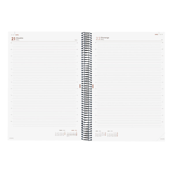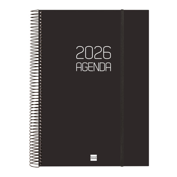 Agenda de espiral de estilo moderno y universal con tapas ligeras de polipropileno. Con goma elástica. Con esquinas microperforadas para localizar rápidamente el día/semana en curso. Agenda con información de interés en la anualidad y otros contenidos extra.