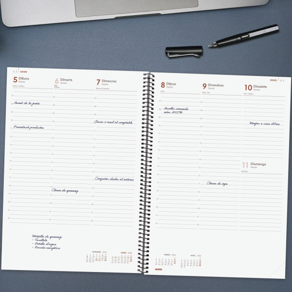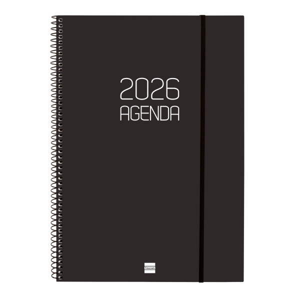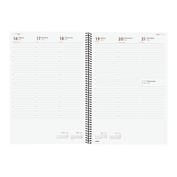 Agenda de espiral de estilo moderno. Con tapas ligeras de polipropileno y goma elástica. Ideal para uso personal y/o profesional. Esquinas microperforadas para localizar rápidamente el día/semana en curso. Agenda con información de interés en la anualidad y otros contenidos extra.
