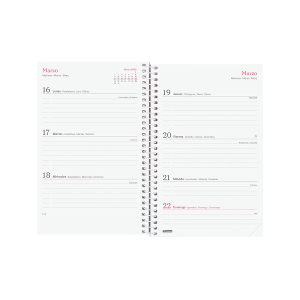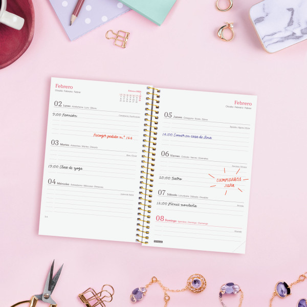 Agenda de espiral con tapas ligeras de polipropileno. Diseño en tendencia y a la moda. Ideal para uso personal y/o profesional. Con goma elástica. Con esquinas microperforadas para localizar rápidamente el día/semana en curso. El diseño interior es limpio y fácil, con espacio suficiente para organizar tus proyectos, tareas y compromisos. Agenda con información de interés en la anualidad y otros contenidos extra orientados a la organización personal.