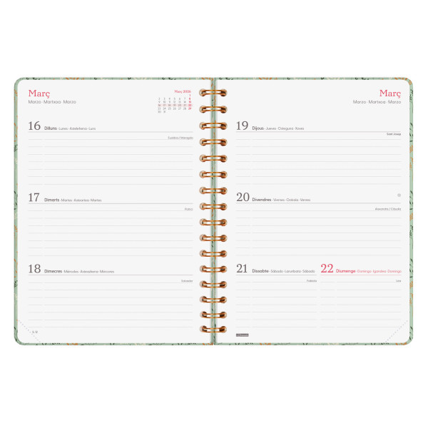 Agenda de espiral con tapa dura de cartón forrado con peliculado mate antirayaduras. Diseño elegante, en tendencia y a la moda, con detalles estampados metalizados. Ideal para uso personal y/o profesional. Con goma elástica. Esquinas microperforadas para localizar rápidamente el día/semana en curso. El diseño interior es limpio y fácil, con espacio suficiente para organizar tus proyectos, tareas y compromisos.