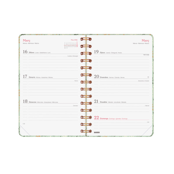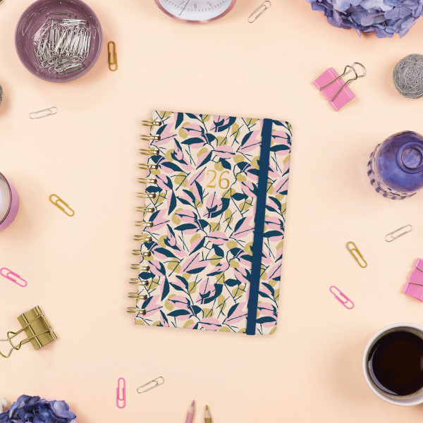 Agenda de espiral con tapa dura de cartón forrado con peliculado mate antirayaduras. Diseño elegante, en tendencia y a la moda, con detalles estampados metalizados. Ideal para uso personal y/o profesional. Con goma elástica. Esquinas microperforadas para localizar rápidamente el día/semana en curso. El diseño interior es limpio y fácil, con espacio suficiente para organizar tus proyectos, tareas y compromisos.