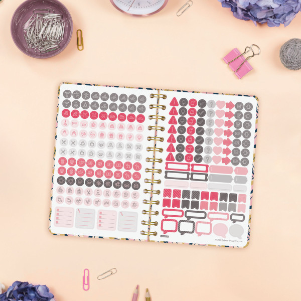 La agenda incorpora un set de pegatinas muy completo, diseñadas para que te puedas organizar mejor a todos los niveles: una página de 138 iconos temáticos para tareas y compromisos personales y profesionales; otra página con 53 señalizadores y marcadores personalizables; y otra con 96 pictos y símbolos para decorar y destacar los asuntos más relevantes que escribas.