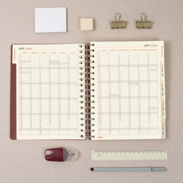 La agenda es de tapa dura de polipropileno, con espiral doble, goma elástica y dispone de dos cintas punto para poder acceder rápidamente a las secciones que desees. La anualidad contiene información útil y de interés. En el inicio de la agenda dispondrás de un apartado introductorio donde se detalla cómo usar la agenda para sacarle el máximo partido; un tutorial con recomendaciones útiles de organización personal.