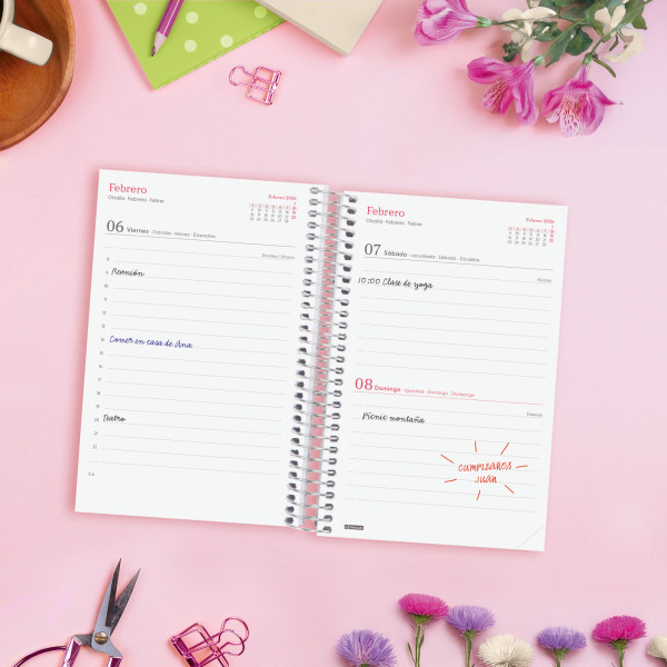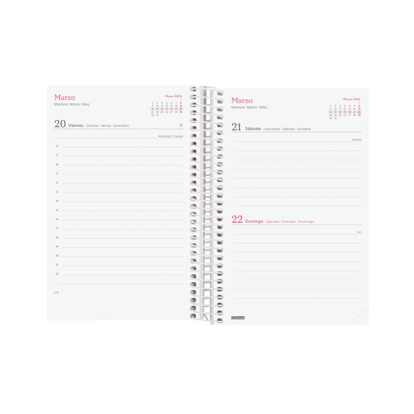 Agenda de espiral con tapas ligeras de polipropileno. Diseño en tendencia y a la moda. Ideal para uso personal y/o profesional. Con goma elástica. Con esquinas microperforadas para localizar rápidamente el día/semana en curso. El diseño interior es limpio y fácil, con espacio suficiente para organizar tus proyectos, tareas y compromisos. Agenda con información de interés en la anualidad y otros contenidos extra orientados a la organización personal.