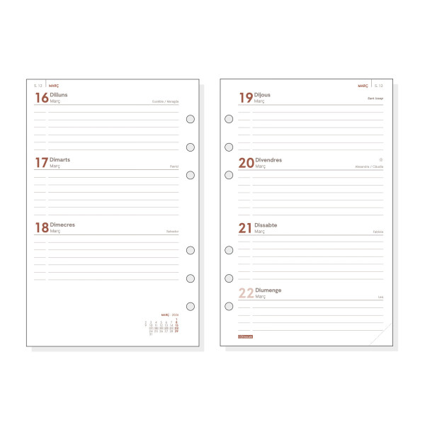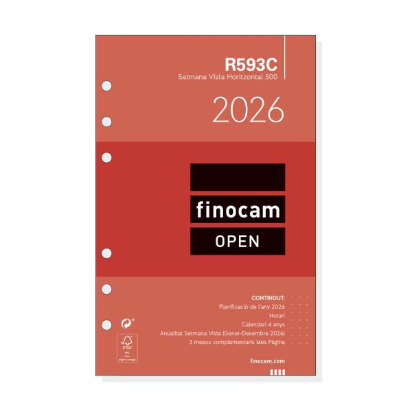 Recambio anual para agendas de anillas Finocam Open. La anualidad contiene la información útil relativa a: onomástica (excepto ed. portuguesa), festivos nacionales, cambios de estación e inicios de los años nuevos chino, musulmán, ortodoxo y hebreo.